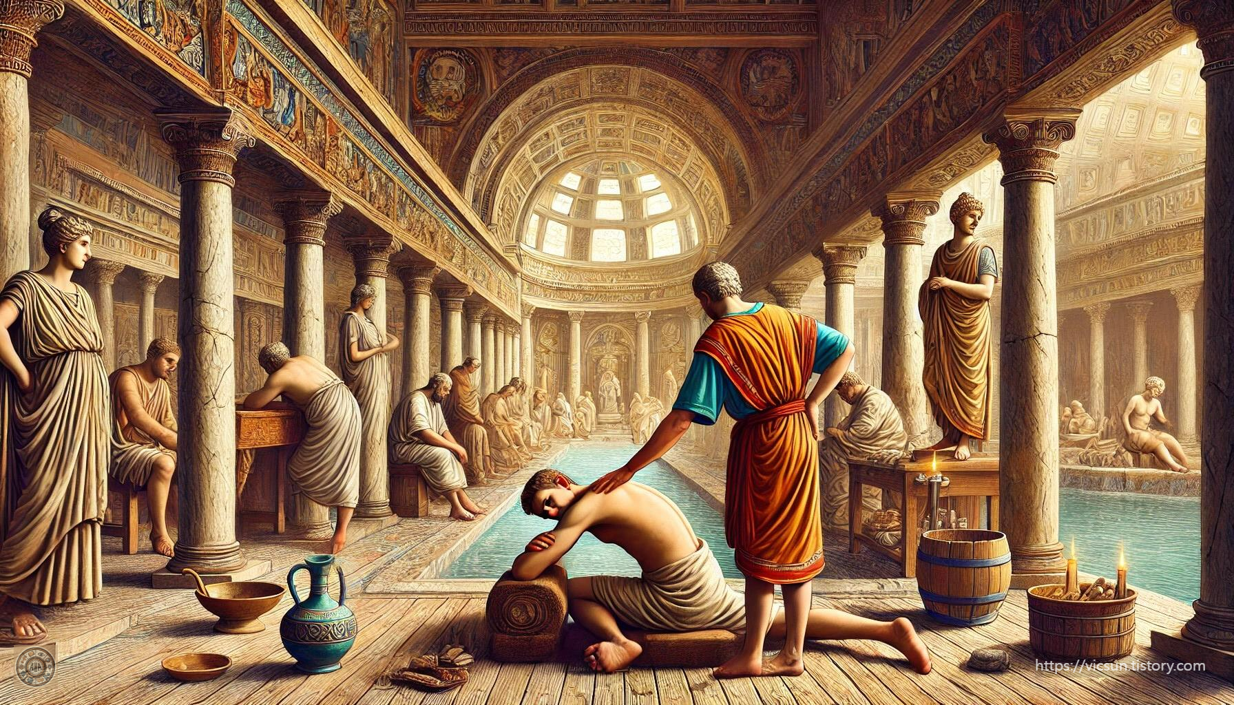 실제로 로마 목욕탕에는 마사지 서비스도 있었고, 목욕 후 올리브 오일을 몸에 바르는 것이 일반적이었습니다.